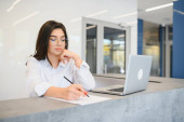 Młoda bizneswoman siedzi w miejscu pracy i czyta w biurze