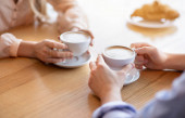 Para kochanków trzymających się za ręce podczas romantycznej randki w kawiarni, delektujących się obiadem, pijących kawę, zbliżenie