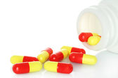 Witaminy, lek w białej i czerwonej kapsułce w butelce wyizolowanej na białym tle.