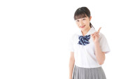 Student z uśmiechem wskazujący