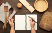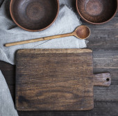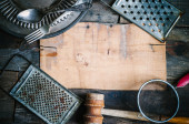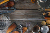 bardzo stare drewniane przedmioty kuchenne vintage: sito, wałek, puste łyżki i okrągłe talerze na brązowym drewnianym stole, widok z góry