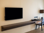 Gabinet i telewizor z głośnikami w salonie nowoczesnego mieszkania