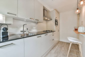 Zdjęcie "Wnętrze kuchni w nowoczesnym apartamencie" może być wykorzystywane do celów osobistych i komercyjnych zgodnie z warunkami zakupionej licencji Royalty-free. Obraz jest dostępny do pobrania w jakości wysokiej rozdzielczości do 5760x3840.