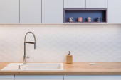 Zdjęcie "Wnętrze kuchni w nowoczesnym apartamencie" może być wykorzystywane do celów osobistych i komercyjnych zgodnie z warunkami zakupionej licencji Royalty-free. Obraz jest dostępny do pobrania w jakości wysokiej rozdzielczości do 5760x3840.