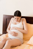 Młoda ciężarna kobieta nakłada krem na brzuch rano w łazience. Koncepcja ciąży, macierzyństwa i pielęgnacji ciała.