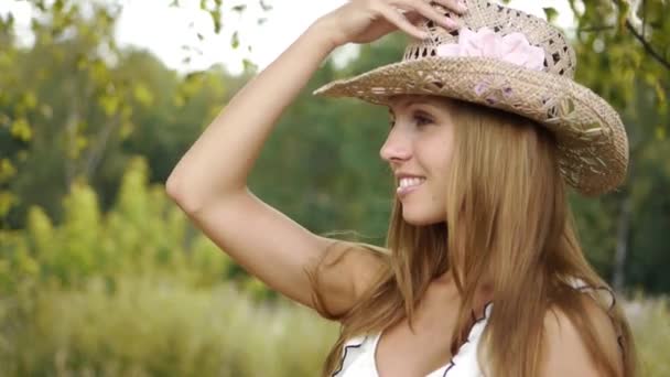 Młoda, ładna, uśmiechnięta kobieta z długimi włosami w niebieskiej bluzce i dżinsach na tle letniego zielonego parku miejskiego.