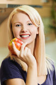młody słodkie uśmiechnięta kobieta w zielony bluzka rozciąga Duży czerwony jabłko w letni park.