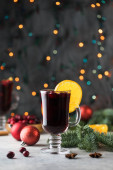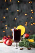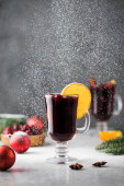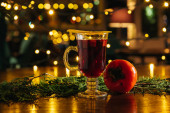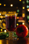 Wino musujące z persymoną i mango na stole w restauracji. Zimowy i jesienny gorący napój alkoholowy.