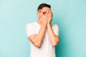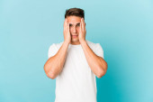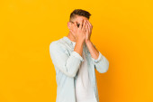 młody przystojny biały mężczyzna odizolowany mając zabawy pokrycie połowa z twarz z dłoń.