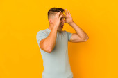 Zdjęcie "młody przystojny biały mężczyzna odizolowany mając zabawy pokrycie połowa z twarz z dłoń." może być wykorzystywane do celów osobistych i komercyjnych zgodnie z warunkami zakupionej licencji Royalty-free. Obraz jest dostępny do pobrania w jakości wysokiej rozdzielczości do 5760x3840.