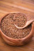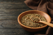 Ręcznik kuchenny, miska z roślin strączkowych i łyżka na drewnianym tle