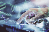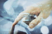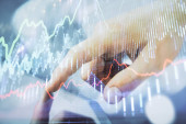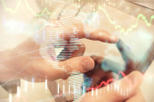 Wielokrotne narażenie rąk człowieka trzymających i korzystających z telefonu i wykresu finansowego rysunku. Koncepcja analizy rynku.