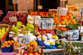 Rynek Il Capo w Palermo na Sycylii. Różnorodne stoiska handlowe. Jest to jeden z kilku popularnych targów ulicznych w Palermo.