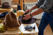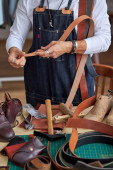 profesjonalny szewc mierzący but z taśmą pomiarową w warsztacie