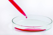 Hodowla bakterii w podłożu agarowym w laboratorium mikrobiologicznym. Dokonywanie smugi w szalce Petriego izolowane na białym tle. Mieszanina kolonii bakterii w szalce Petriego.