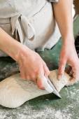 Chleb pełnoziarnisty z domowego ciasta pełnoziarnistego, wykonany przez kobietę w czerwonym fartuchu. Zdrowe ciasto z wieloma ziarnami.