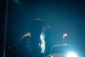 Samotna kobieta spacerująca nocą w dramatycznej ciemnej uliczce. Niebezpieczeństwo i przerażająca koncepcja.