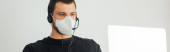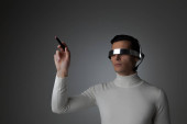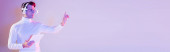 Portret cyborga w słuchawkach i obiektywie cyfrowym na fioletowym tle
