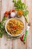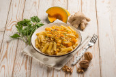 makaron soczewicowy z żółtymi pomidorami i szałwią