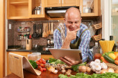 Zdjęcie "Mężczyzna patrząc przepis na laptopa w kuchni w domu." może być wykorzystywane do celów osobistych i komercyjnych zgodnie z warunkami zakupionej licencji Royalty-free. Obraz jest dostępny do pobrania w jakości wysokiej rozdzielczości do 5760x3840.