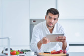Mężczyzna patrząc przepis na laptopa w kuchni w domu.