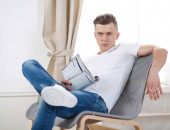 mężczyzna leżał na kanapie wiadomość SMS na telefon