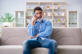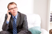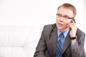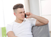 poważny młody chłopak w biały t-shirt rozmowy na telefon
