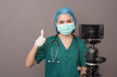 młoda pewna siebie kobieta lekarz w zielonym fartuchu nosi maskę chirurgiczną na szarym tle studio