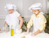 Dwóch uroczych europejskich chłopców przebranych za kucharzy ugniata mąkę, mleko i jajka, dzieci bawią się w kuchni