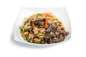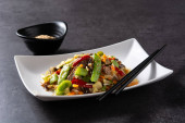 Naczynie z białego ryżu, zielone warzywa, przyprawy i duszone mięso