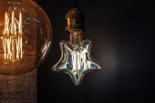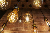 Żyrandole różnych typów w sklepie ze sprzętem oświetleniowym. Na gablocie wisi duży asortyment lamp. Zbliżenie