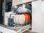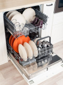 zmywarka zbliżenie z zmywanymi naczyniami, łatwy w użyciu i oszczędność wody, ekologiczne, wbudowana kuchnia zmywarka do naczyń