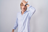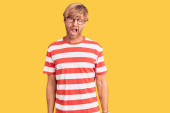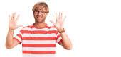 Biały mężczyzna z długimi włosami, noszący luźną koszulę w paski, uśmiechający się z ręki na ucho, słuchający plotek lub plotek. koncepcja głuchoty.