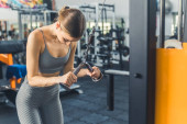 Młoda piękna kobieta w odzieży sportowej ćwiczy z maszyną na siłowni