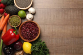 Zdjęcie "Świeże warzywa, owoce i nasiona na czarnym stole, układanie płaskie" może być wykorzystywane do celów osobistych i komercyjnych zgodnie z warunkami zakupionej licencji Royalty-free. Obraz jest dostępny do pobrania w jakości wysokiej rozdzielczości do 5760x3840.