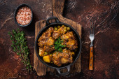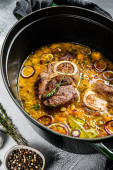 Zdjęcie "Mięso z cielęciny OssoBuco, włoski stek osso buco. Czarne drewniane tło. Widok z góry." może być wykorzystywane do celów osobistych i komercyjnych zgodnie z warunkami zakupionej licencji Royalty-free. Obraz jest dostępny do pobrania w jakości wysokiej rozdzielczości do 5760x3840.
