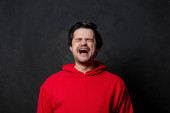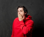 Biały facet w czerwonej bluzie pokazuje cichy gest na ciemnym tle