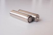 Akumulatory alkaliczne AA na białym, błyszczącym tle z odbiciem. Zamknij dwie puste baterie z przestrzenią do kopiowania