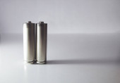 Akumulator alkaliczny AA na białym, błyszczącym tle z odbiciem. Zamknij jeden pusty akumulator z przestrzenią do kopiowania