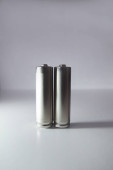 Akumulatory alkaliczne AA na białym, błyszczącym tle z odbiciem. Zamknij dwie puste baterie z przestrzenią do kopiowania. Fotografia pionowa
