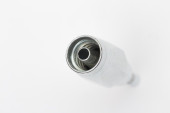 Akumulatory alkaliczne AA na białym, błyszczącym tle z odbiciem. Zamknij dwie puste baterie z przestrzenią do kopiowania