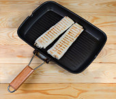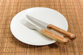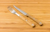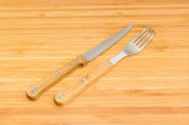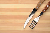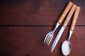 Zestaw sztućców składający się z widelca i noża ze stali nierdzewnej z drewnianymi uchwytami na drewnianej powierzchni bambusa, widok z góry