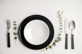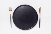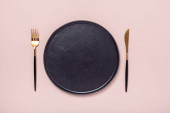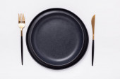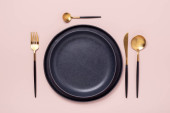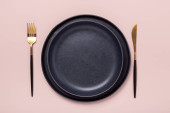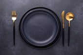Zdjęcie "Pusty czarny ceramiczny talerz, widelec i nóż na kamiennym tle Kopiuj przestrzeń Widok z góry - Obraz" może być wykorzystywane do celów osobistych i komercyjnych zgodnie z warunkami zakupionej licencji Royalty-free. Obraz jest dostępny do pobrania w jakości wysokiej rozdzielczości do 5760x3840.