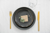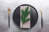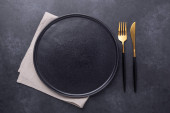Pusty czarny ceramiczny talerz, widelec i nóż na kamiennym tle Kopiuj przestrzeń Widok z góry - Obraz