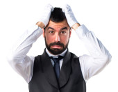 Zdjęcie "flustraded biznesmen na niebieskim tle ," może być wykorzystywane do celów osobistych i komercyjnych zgodnie z warunkami zakupionej licencji Royalty-free. Obraz jest dostępny do pobrania w jakości wysokiej rozdzielczości do 5760x3840.