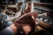 Zdjęcie "Klasyczny kierowca. Biały mężczyzna po czterdziestce w skórzanych rękawiczkach, jeżdżący swoim starszym pojazdem. Historia Motoryzacji." może być wykorzystywane do celów osobistych i komercyjnych zgodnie z warunkami zakupionej licencji Royalty-free. Obraz jest dostępny do pobrania w jakości wysokiej rozdzielczości do 5760x3840.