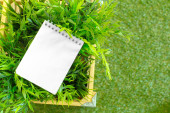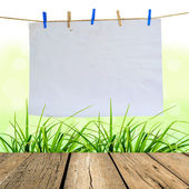 zmięty papier na zielonej trawie z drewniana deska i lato f
