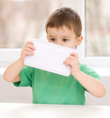 ładny chłopiec jest przytrzymanie puste pusty transparent