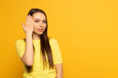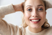 Młoda kobieta w ciepłych ubraniach z dłońmi blisko twarzy patrząc na aparat fotograficzny na białym tle