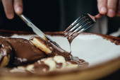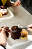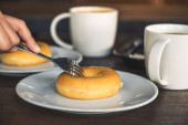 Zbliżenie wizerunek dłoni kobiety krojącej kawałek czekoladowego pączka nożem i widelcem na śniadanie na drewnianym stole